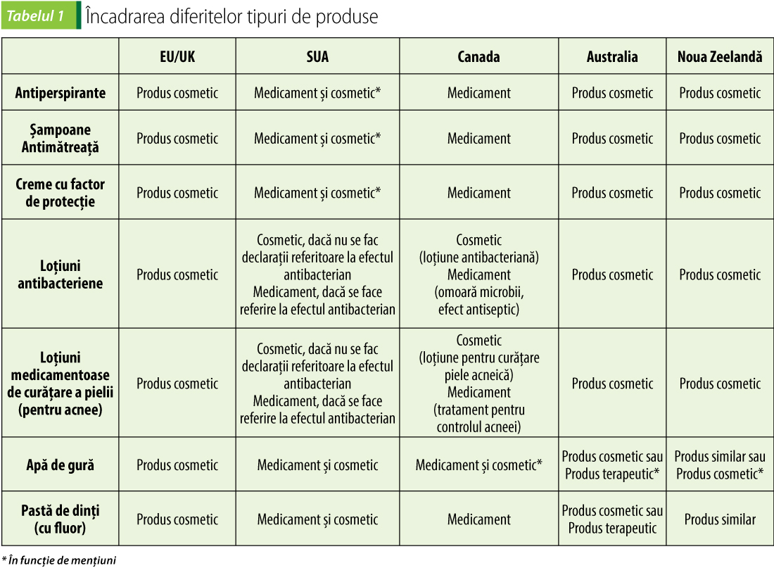 Un raport alcătuit de Australia cu câţiva ani în urmă cuprinde tabelul 1, parte a raportului modificărilor apărute în regulamentul produselor cosmetice, acesta incluzând un exemplu de încadrare a diferitelor tipuri de produse în categoria produselor cosmetice sau a medicamentelor, în funcţie de menţiunile agreate pe etichetă sau de declaraţiile referitoare la produs.