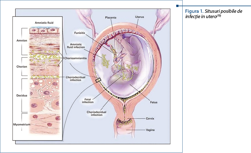 Infecţiile provocate de bacteriile intrauterine sunt considerate a fi cauza principală a infecţiilor asociate prematurităţii. Deşi cavitatea amniotică este considerată sterilă, mai puţin de 1% dintre femeile în travaliu la termen vor avea bacterii în lichidul amniotic. Prin urmare, izolarea bacteriilor din lichidul amniotic este patologică, fiind definită ca o invazie microbiană a cavităţii amniotice. Cele mai multe dintre aceste infecţii sunt subclinice şi nu pot fi detectate fără analiza lichidului amniotic. Frecvenţa acestor infecţii depinde de forma clinică şi de vârsta gestaţională. La mamele cu travaliu prematur cu membrane intacte, rata de culturi pozitive din lichidul amniotic este de 12,8%(10). La femeile cu ruptură prematură a membranelor la internare, rata de culturi pozitive din lichidul amniotic este de 32,4%. O observaţie interesantă şi consistentă este aceea că, cu cât este mai mică vârsta gestaţională la prezentare (travaliu prematur cu membrane intacte), cu atât mai mare este frecvenţa de culturi pozitive din lichidul amniotic(11). Aceasta s-ar putea traduce şi ca o vulnerabilitate mai mare a membranelor amniotice, invers proporţională cu vârsta de gestaţie.