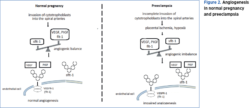 Mecanismul patogen al preeclampsiei implică disfuncţia endotelială din cauza angiogenezei deficitare, cu un dezechilibru între factorii circulanţi proangiogenici şi antiangiogenici. Angiogeneza apare atât în condiţii normale, cât şi patologice, având un rol esenţial în dezvoltarea embrionară şi placentară. Unul dintre cei mai importanţi factori de creştere cu rol în reglarea angiogenezei este factorul de creştere a endoteliului vascular (VEGF), care îşi exercită funcţia după legarea la trei receptori, VEGFR-1 (receptorul de tip 1 al factorului de creştere a endoteliului vascular; flt-1), VEGFR-2 (receptorul de tip 2 al factorului de creştere a endoteliului vascular; KDR) şi VEGFR-3 (receptorul de tip 3 al factorului de creştere a endoteliului vascular; flt-4). Legarea VEGF de forma solubilă a VEGFR (sVEGFR sau sflt-1) are efect antiangiogenic. Placenta pacientelor preeclamptice supraexprimă sflt-1, care intră în circulaţia maternă, se leagă de VEGF şi determină spre sfârşitul sarcinii hipertensiune şi proteinurie. Sflt-1 ar putea fi utilizat ca test diagnostic de rutină pentru preeclampsie, pentru diferenţierea preeclampsiei de alte boli, şi ca factor de prognostic pentru naşterea iminentă la femeile preeclamptice. De asemenea, sflt-1 ar putea fi o ţintă pentru acţiunea medicamentelor în tratamentul preeclampsiei.Cuvinte Cheie