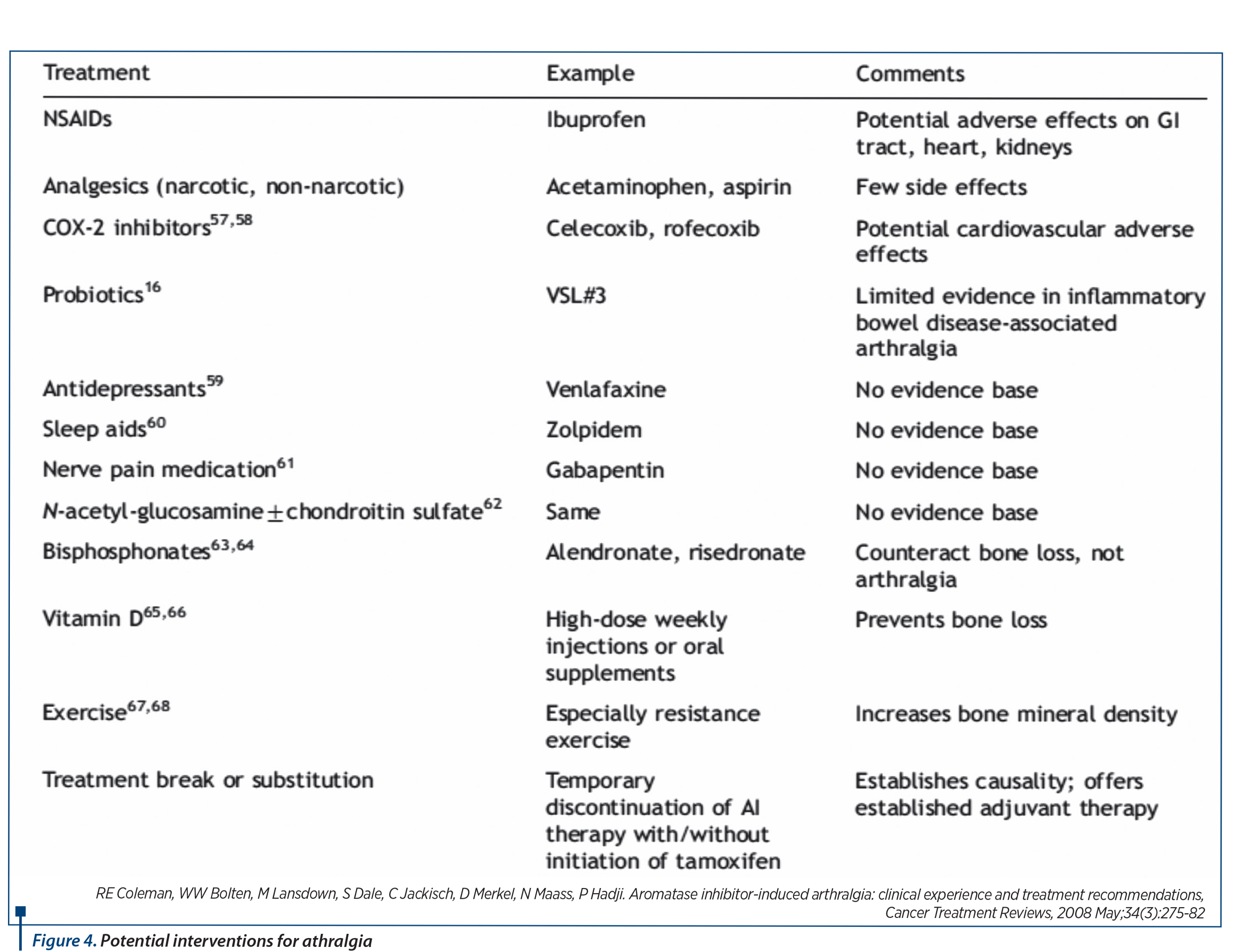 9. RE Coleman, WW Bolten, M Lansdown, S Dale, C Jackisch, D Merkel, N Maass, P Hadji - Aromatase inhibitor-induced arthralgia: clinical experience and treatment recommendations, Cancer Treatment Reviews, 2008 May;34(3):275-82.
