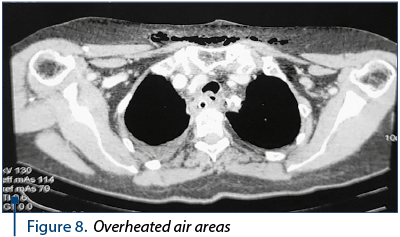 The CT scan 2944 performed on March 16, 2016, at five days postoperatively, consisted of the diffuse infiltration of the retrolaryngeal mass with a mass effect at the laryngeal level and the left anterolateral dislocated esophagus with diffuse parietal thickening; cervical posterior air areas with mediastinal-cervical drainage (Figure 8); posterior mediastinal infiltration zone in the upper and middle third adjacent to the esophagus. Bilateral pleural fluid. Gastrostomy present; subcutaneous emphysema of the cervical and thoracic region.