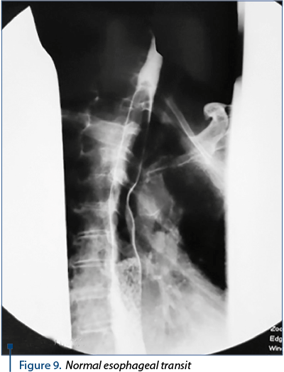 The success we had with the healing of this serious case has led us to consider the condition of the esophagus and the way of eating naturally within 6 months. The esophageal contrast-transient study revealed the lumen of the esophagus, without the stenosis area, with preserved morphology (Figure 9).