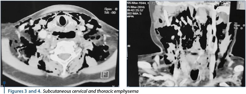 The urgent CT scan (2773/11.03.2016) revealed the diffuse thickening of the upper cervical and thoracic esophagus wall, with the delimitation of a fluid, inhomogeneous, diffusely delimited area with hydroaeric (Figures 1 and 2), cervical inferior and superior mediastinal visual (C5-T4) displayed posterolateral as it compressed the esophagus and partly the posterior wall of the trachea. Diffuse perilaryngeal infiltration with diminishing the laryngeal lumen, the infracentimetric hyper density zone of the suspected cervical inferior body (C7) anterolateral left in relation to esophageal wall; subcutaneous emphysema is marked on the cervical, thoracic and middles and posterior mediastinal level in the upper third (Figures 3 and 4). Bilateral pleural fluid. No changes in pulmonary transparency.