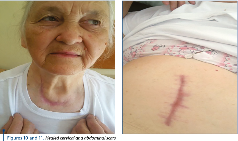The biological constants were within normal limits, and cervical and abdominal postoperative scars healed (Figures 10 and 11). The gravity of the esophageal and pharyngeal suppurations with mediastinal extension is presented by Romanian authors (1,7,8,10,11) and foreign authors(2,3,4,5,6,9) in various articles published, including a monograph.