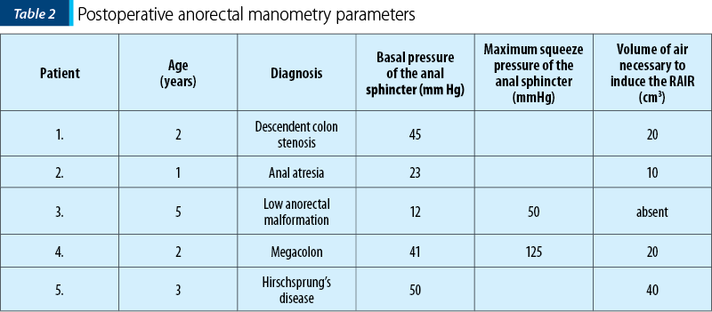 We performed the postoperative evaluation of five patients. The diagnosis for which the surgical procedure was indicated, the age at which anorectal manometry was performed and the evaluated anorectal manometry features are shown in Table 2. The 1-year-old patient in which the surgical intervention was performed for anal atresia and the 5-year-old child in which surgery was indicated for low anorectal malformation had low values of the basal pressure of the anal sphincter.